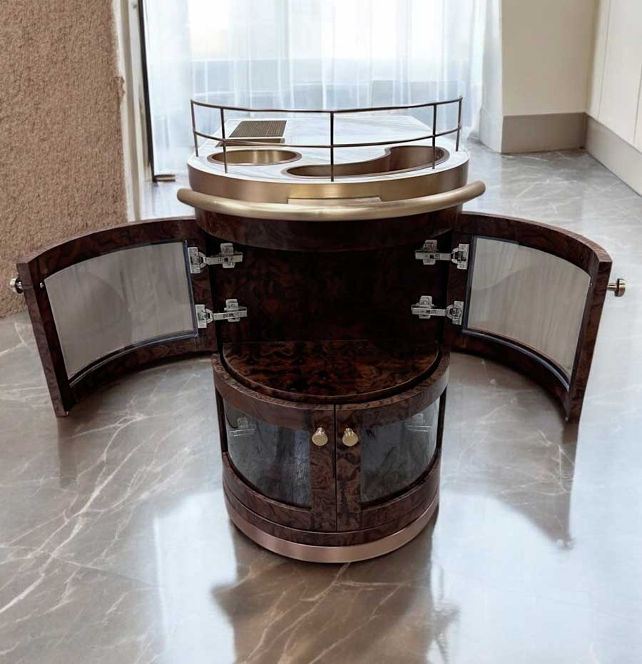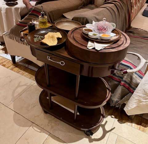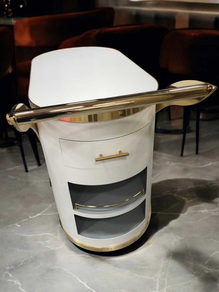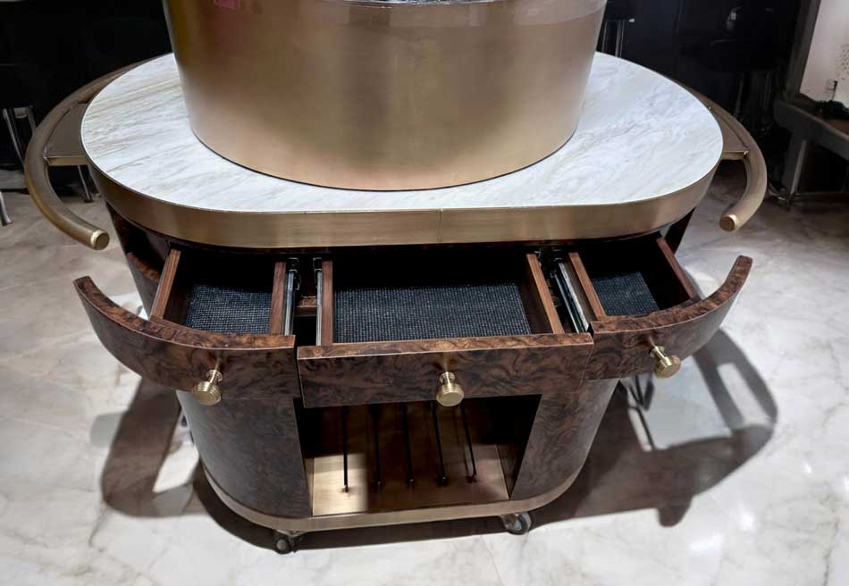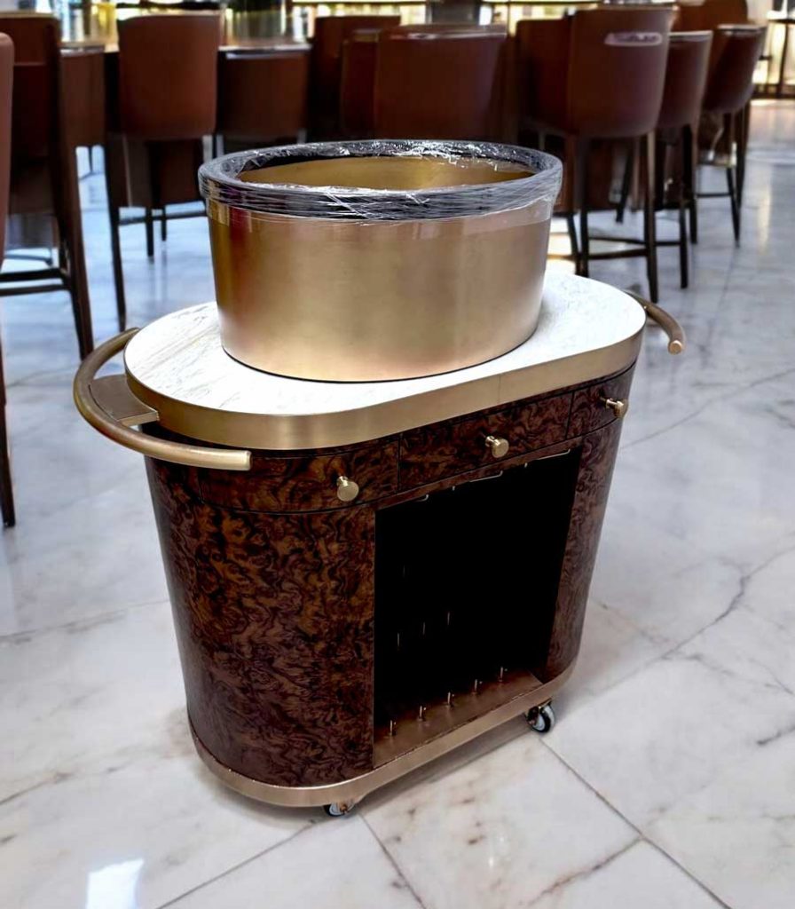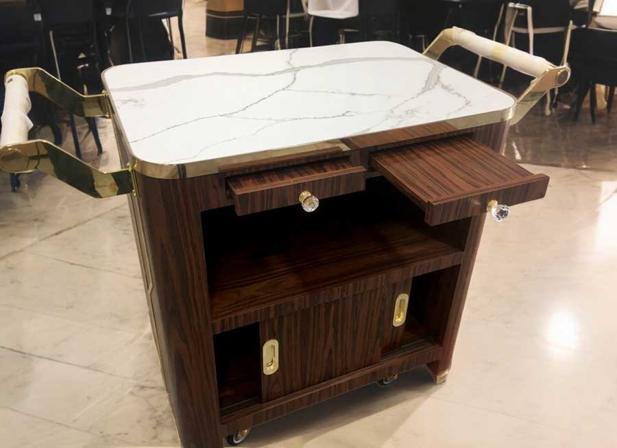 Crafted from the finest materials, from sleek stainless steel and lustrous wood finishes, our beverage carts exude sophistication and style. It offers ample storage for a variety of beverages, glassware, and bar accessories. The cart’s casters allow it to effortlessly glide from room to room, offering guests the convenience of table-side service.